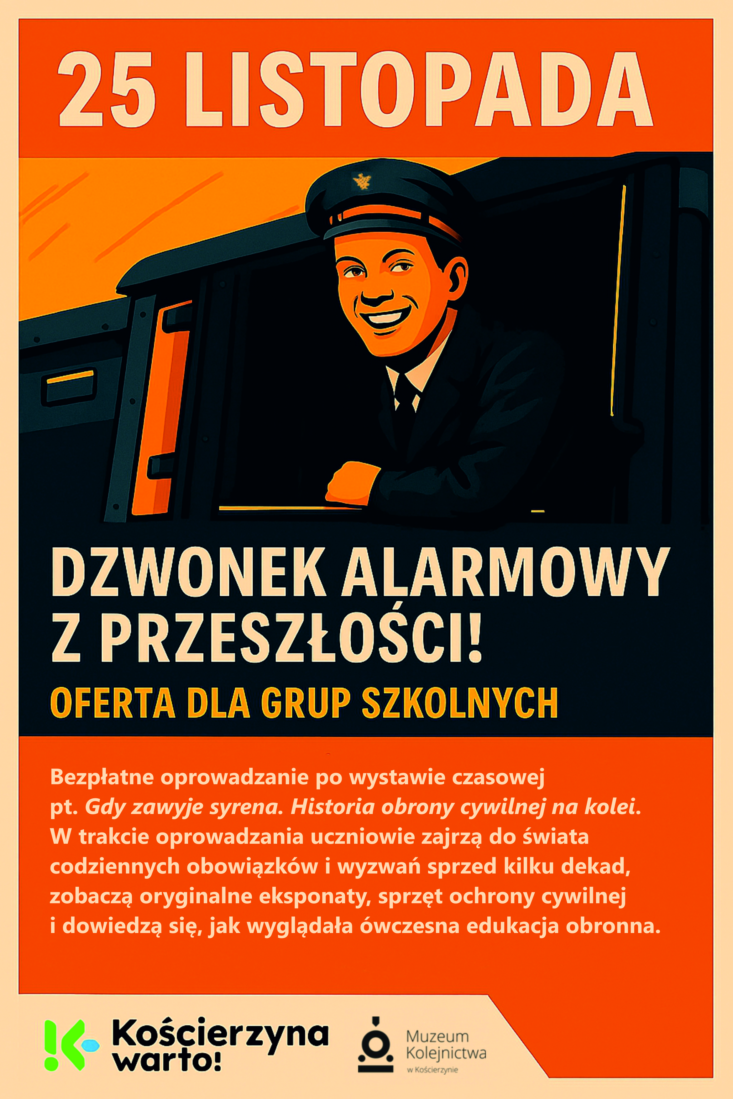 Z okazji Dnia Kolejarza Muzeum Kolejnictwa w Kościerzynie zaprasza grupy szkolne do odwiedzenia i udziału w specjalnym bezpłatnym oprowadzaniu po nowej wystawie czasowej pt. „Gdy zawyje syrena. Historia obrony cywilnej na kolei”.