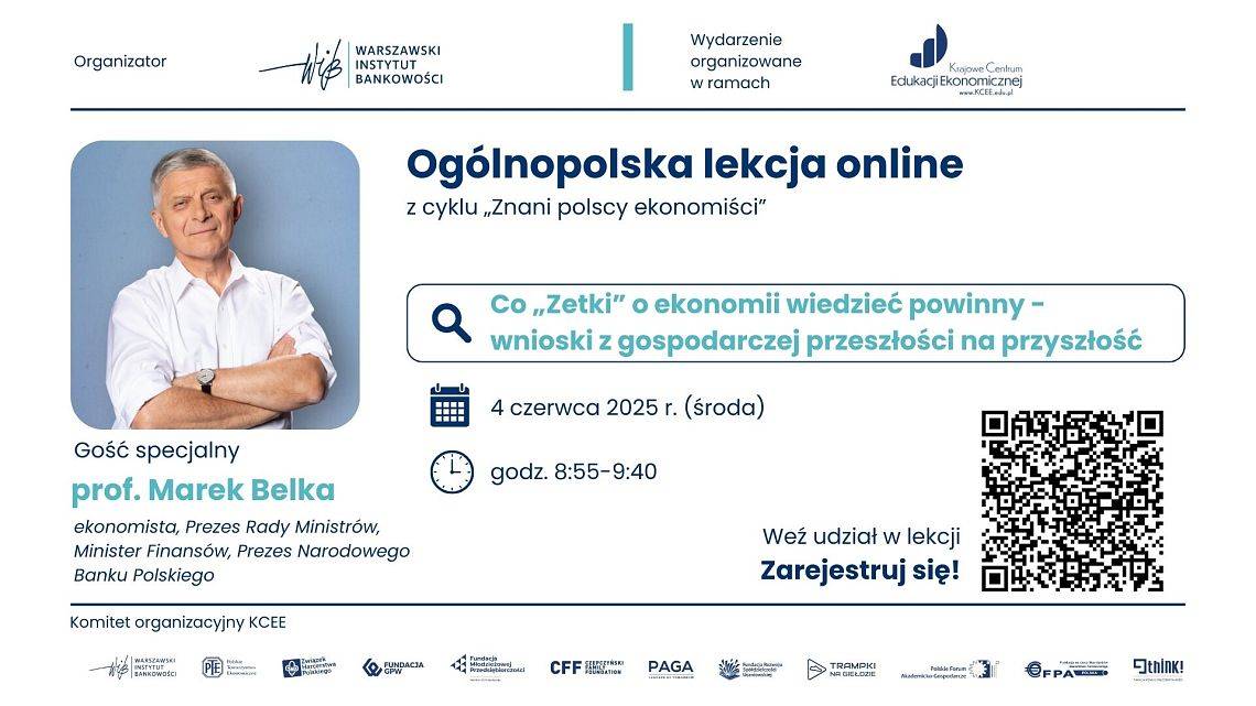 Fundacja Warszawski Instytut Bankowości zaprasza nauczycieli oraz uczniów szkół ponadpodstawowych oraz starszych klas w szkołach podstawowych do udziału w ogólnopolskiej lekcji online z cyklu „Znani polscy ekonomiści”: Co „Zetki” o ekonomii wiedzieć powinny - Wnioski z gospodarczej przeszłości na przyszłość.