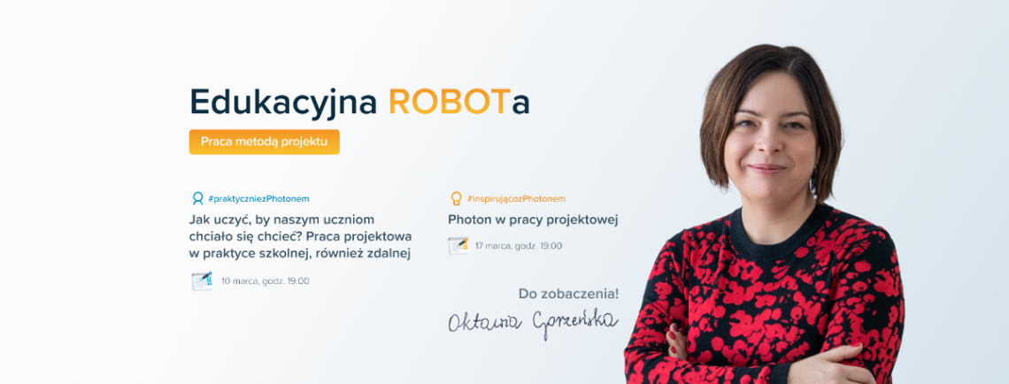 Zapisy na wydarzenia: za pośrednictwem strony https://edukacyjnarobota.photon.education lub bezpośrednio na Clickmeetingu: https://photoneducation.clickmeeting.com .