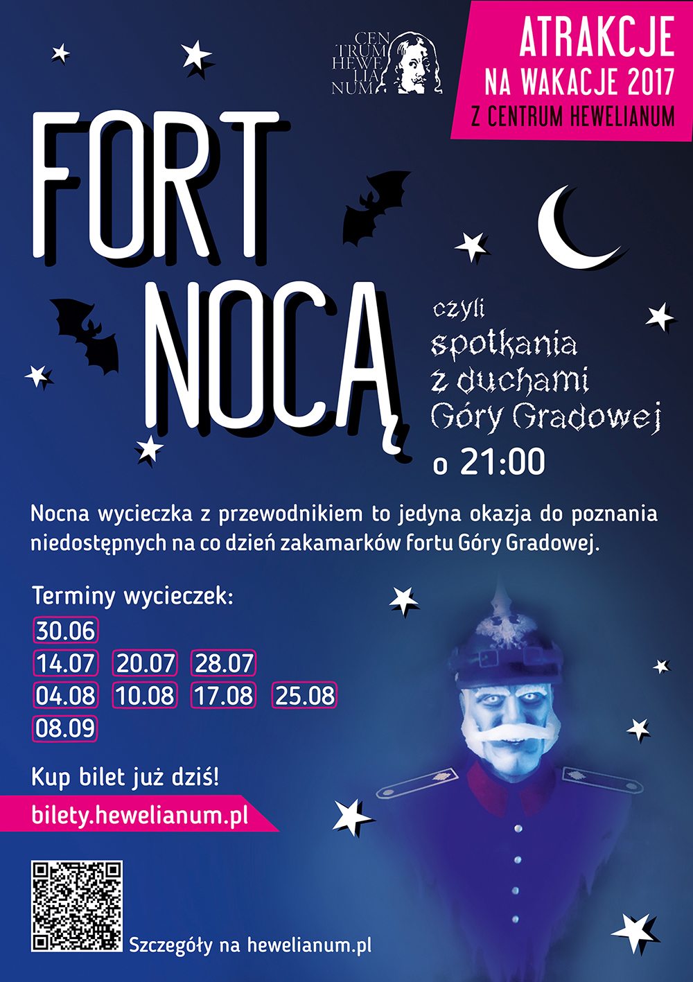W okresie wakacyjnym Centrum Hewelianum zaprasza na zwiedzanie Fortu nocą, czyli spotkania z duchami Góry Gradowej. szczegóły na plakacie: zobacz