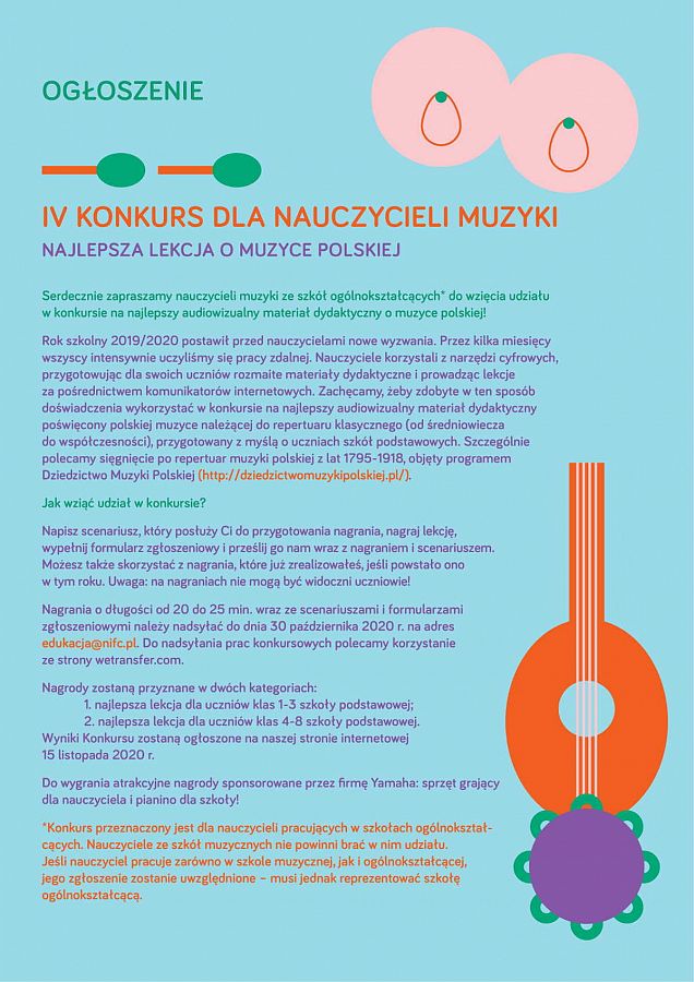 Narodowy Instytut Fryderyka Chopina zaprasza nauczycieli muzyki szkół podstawowych ogólnokształcących do udziału w konkursie pn. „Najlepsza lekcja o muzyce polskiej”. Uczestnicy są zobowiązani do przesłania audiowizualnego materiału dydaktycznego oraz scenariusza do tego materiału.