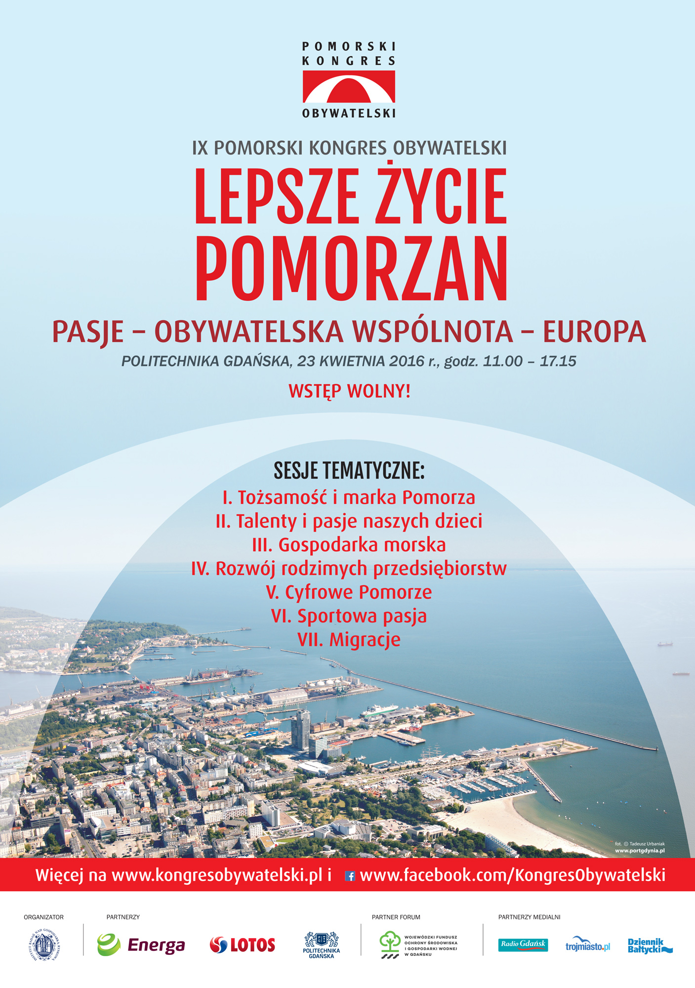 Zapraszamy na IX Pomorski Kongres Obywatelski pt. „Lepsze życie Pomorzan. Pasje – Obywatelska wspólnota – Europa”, który odbędzie się w dniu 23 kwietnia 2016 roku, w Gmachu Głównym Politechniki Gdańskiej w godz. 11:00-17:15. Organizatorem Kongresu jest Instytut Badań nad Gospodarką Rynkową, przy udziale wielu Partnerów tj.: Energa, Lotos, Politechnika Gdańska i organizacji współpracujących, w tym m.in. Centrum Edukacji Nauczycieli w Gdańsku. Hasłem Kongresu są „Pasje – Obywatelska Wspólnota – Europa”, które organizatorzy stawiają jako trzy pasma drogi do lepszego życia Pomorzan. Wstęp wolny. Obowiązkowa rejestracja pod adresem: https://rejestracja.ibngr.pl/kongresobywatelski/ Obrady odbędą się w siedmiu sesjach tematycznych: - Jaka tożsamość i marka Pomorza?