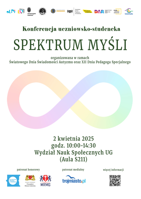 Zapraszamy uczniów, studentów, rodziców, nauczycieli i wykładowców 2 kwietnia 2025 r. na uczniowsko-studencką konferencję „Spektrum myśli” organizowaną w ramach Światowego Dnia Świadomości Autyzmu i XII Dnia Pedagoga Specjalnego przez Ogólnokształcące Liceum Programów Indywidualnych im. adm. Józefa Unruga, Liceum Sztuk Plastycznych im. Jacka Mydlarskiego w Gdańsku i Koło Naukowe Pedagogów Specjalnych „Porta” Uniwersytetu Gdańskiego.