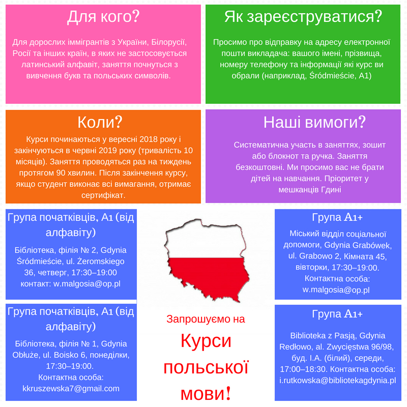 Miejska Biblioteka Publiczna w Gdyni prowadzi lekcje języka polskiego w ramach projektu "Język polski jako obcy w Bibliotece Gdynia". Grupy dedykowane są głównie osobom tzw. rosyjskojęzycznym, ale również biblioteka otworzyła kurs dla osób tzw. anglojęzycznych. Zajęcia odbywają się w różnych dzielnicach, jak: Redłowo, Śródmieście, Grabówek, Chylonia i Obłuże. Obecnie biblioteka posiada 8 grup o różnym poziomie zaawansowania (A1, A1+, A2). Zajęcia są bezpłatne i prowadzone we współpracy z Urzędem Miasta Gdyni. Trwają 10 miesięcy, 1 raz w tygodniu po 90 minut i zakończone są wręczeniem zaświadczenia potwierdzającego ukończenie kursu na danym poziomie. Nauczyciele to profesjonalni, dyplomowani lektorzy języka obcego jako obcego. Warunkami uczestnictwa są regularna obecność na zajęciach (prowadzone są listy obecności) oraz samodzielne wysłanie e-maila do konkretnego nauczyciela (w języku polskim, ukraińskim lub rosyjskim). kontakt z realizatorem: i.rutkowska@bibliotekagdynia.pl, tel. 58 664 84 70 ulotka Ukraina: OTWÓRZ ulotka Rosja: OTWÓRZ źródło: Miejska Biblioteka Publiczna w Gdyni (stan na dzień 29 sierpnia 2018 roku)