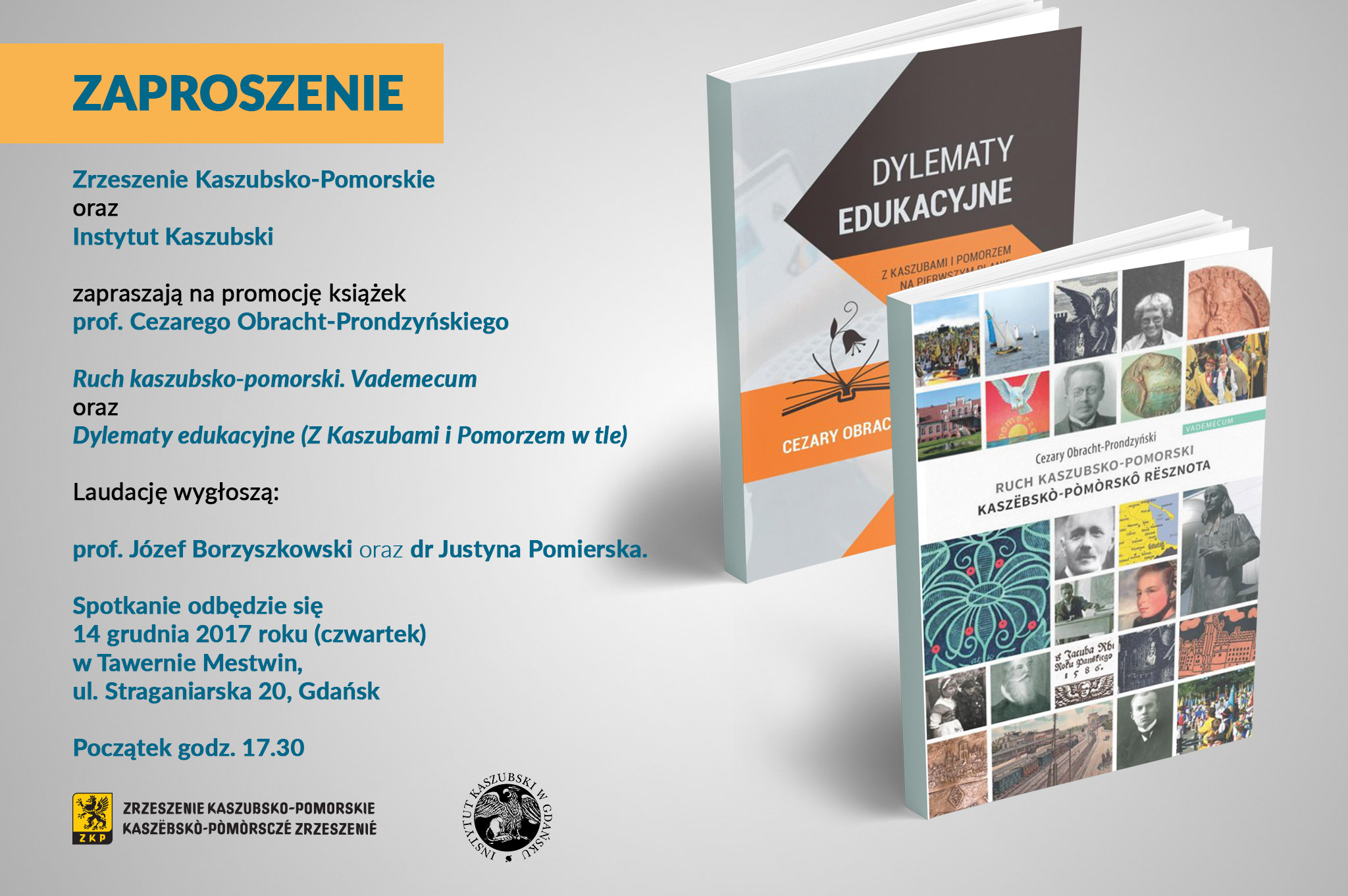 Zrzeszenie Kaszubsko-Pomorskie oraz Instytut Kaszubski zapraszają na promocję książek prof. Cezarego Obracht-Prondzyńskiego Ruch kaszubsko-pomorski. Vademecum oraz Dylematy edukacyjne (Z Kaszubami i Pomorzem w tle). Laudację wygłoszą prof. Józef Borzyszkowski oraz dr Justyna Pomierska. Spotkanie odbędzie się 14 grudnia 2017 roku (czwartek) w Tawernie Mestwin, ul. Straganiarska 20, Gdańsk Początek godz. 17.30 zaproszenie: zobacz źródło: Instytut Kaszubski (stan na dzień 1 grudnia 2017 r.)