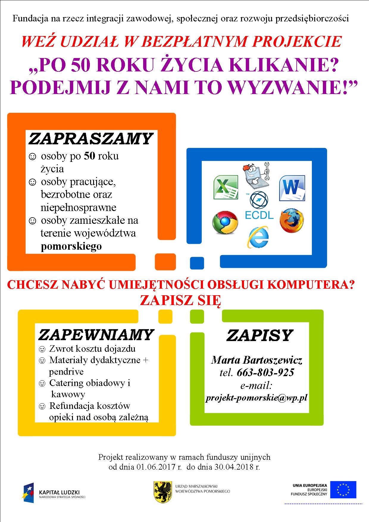 Trwa rekrutacja do projektu "Po 50 roku życia klikanie? Podejmij z nami to wyzwanie!" Do projektu mogą zgłaszać się kobiety i mężczyźni w wieku powyżej 50 r.ż. (nie więcej niż 70 lat), z miejscem zamieszkania w województwie pomorskim. Celem projektu jest nabycie przez uczestników projektu kompetencji komputerowych w pełnym poziomie zgodnie z Ramą Kompetencji Cyfrowych DIGCOMP zgodnie z wytycznymi w zakresie monitorowania postępu rzeczowego realizacji programów operacyjnych na lata 2014-2020. Szkolenia komputerowe planowane są w 25 grupach po 16 osób i zostaną zakończone egzaminem. Pozytywna ocena pozwoli nabyć Uczestnikowi Projektu certyfikat ECDL Profile. Ścieżka wsparcia, którą organizatorzy zapewniają uczestnikom: - podstawy pracy z komputerem - podstawy pracy w sieci - IT Security - przetwarzanie tekstów (MS Office WORD) - arkusze kalkulacyjne (MS Office Excel) -Computational Thinking Ponadto realizatorzy projektu zapewniają: - refundację kosztów dojazdu, - refundacje opieki nad osoba zależną, - materiały pomocnicze i dydaktyczne, - zestawy szkoleniowe + pendrive, - catering obiadowy i kawowy. Zgłoszenia należy przesyłać na adres e-mail: projekt-pomorskie@wp.pl lub zgłaszać telefonicznie do Pani Marty Bartoszewicz tel. 663-803-925. plakat: zobacz [wp-svg-icons icon="screen" wrap="i"]
