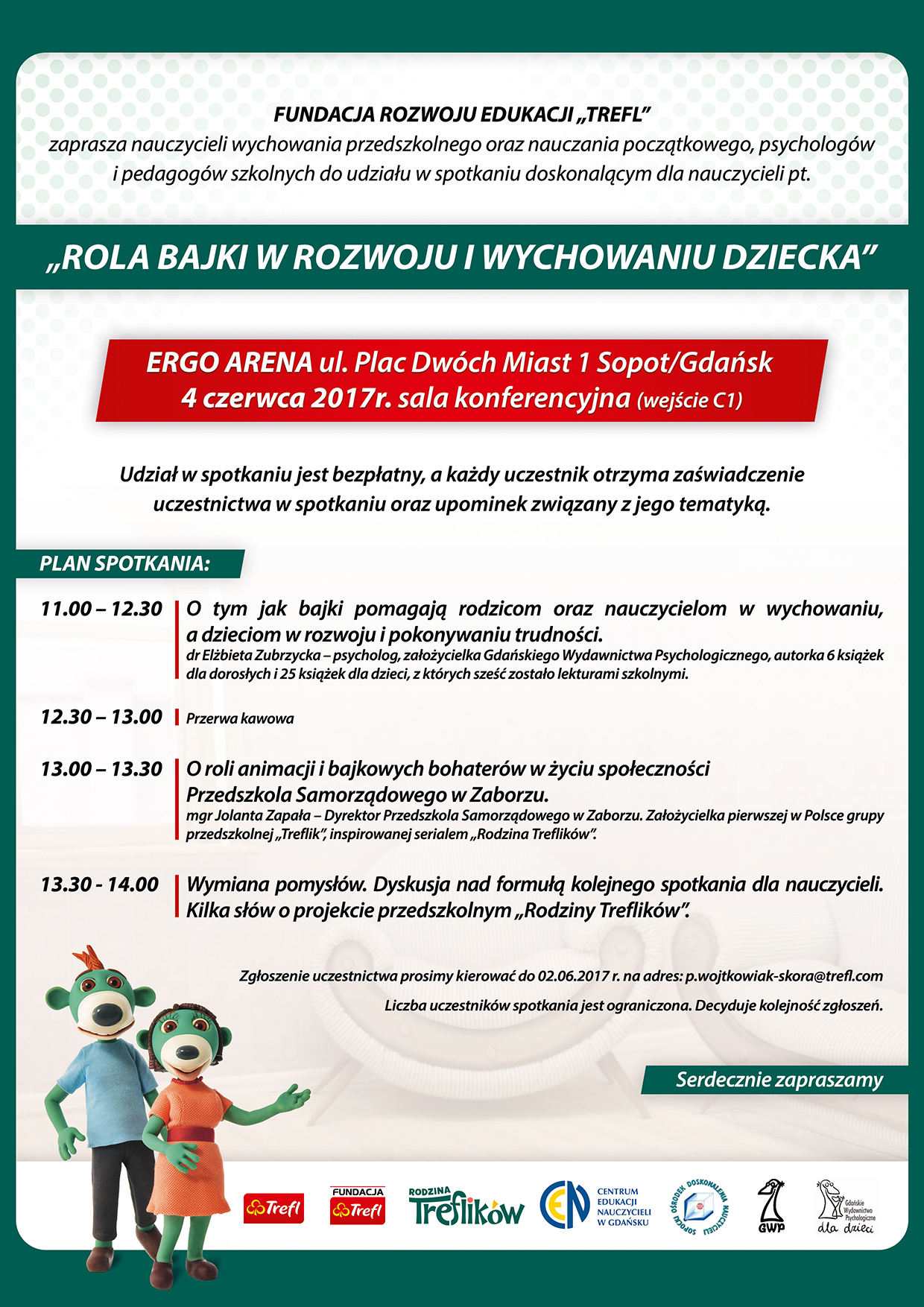 Fundacja Rozwoju Edukacji „TREFL” zaprasza nauczycieli wychowania przedszkolnego oraz nauczycieli nauczania początkowego, psychologów i pedagogów szkolnych do udziału w spotkaniu pt. ROLA BAJKI W ROZWOJU I WYCHOWANIU DZIECKA Udział w spotkaniu jest bezpłatny, a każdy uczestnik otrzyma zaświadczenie uczestnictwa w spotkaniu oraz upominek związany z tematyką spotkania. termin: 4 czerwca 2017 r. (niedziela), godz. 11.00-14.00 miejsce: ERGO ARENA, ul. Plac Dwóch Miast 1, Sopot/Gdańsk, sala konferencyjna (wejście C1) PLAN SPOTKANIA: • 11.00 – 12.30 O tym jak bajki pomagają rodzicom oraz nauczycielom w wychowaniu, a dzieciom w rozwoju i pokonywaniu trudności. /dr Elżbieta Zubrzycka – psycholog, założycielka Gdańskiego Wydawnictwa Psychologicznego, autorka 6 książek dla dorosłych i 25 książek dla dzieci, z których sześć zostało lekturami szkolnymi. • Przerwa kawowa • 13.00 – 13.30 O roli animacji i bajkowych bohaterów w życiu społeczności Przedszkola Samorządowego w Zaborzu. /mgr Jolanta Zapała – Dyrektor Przedszkola Samorządowego w Zaborzu. Założycielka pierwszej w Polsce grupy przedszkolnej „Treflik”, inspirowanej serialem „Rodzina Treflików”. • 13.30 - 14.00 - Wymiana pomysłów. Dyskusja nad formułą kolejnego spotkania dla nauczycieli. Kilka słów o projekcie przedszkolnym „Rodziny Treflików”. Zgłoszenie uczestnictwa do 02.06.2017 r. należy kierować na adres: p.wojtkowiak-skora@trefl.com Liczba uczestników spotkania jest ograniczona. zaproszenie: zobacz Wydarzenie objęte zostało patronatem merytorycznym Centrum Edukacji Nauczycieli w Gdańsku.
