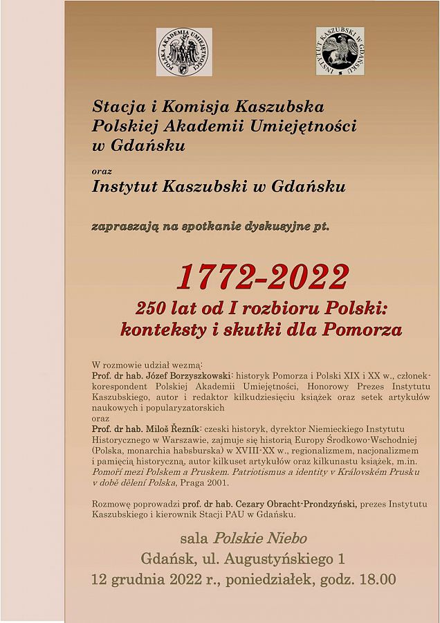 Spotkanie dyskusyjne: 1772–2022 – 250 lat od I rozbioru Polski: konteksty i skutki dla Pomorza