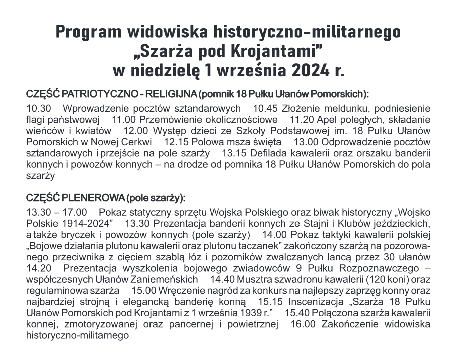 Gmina Chojnice, Fundacja „Szarża Pod Krojantami” oraz Szkoła Podstawowa w Nowej Cerkwi zapraszają do Krojant w niedzielę, 1 września 2024 roku, na widowisko historyczno-militarne