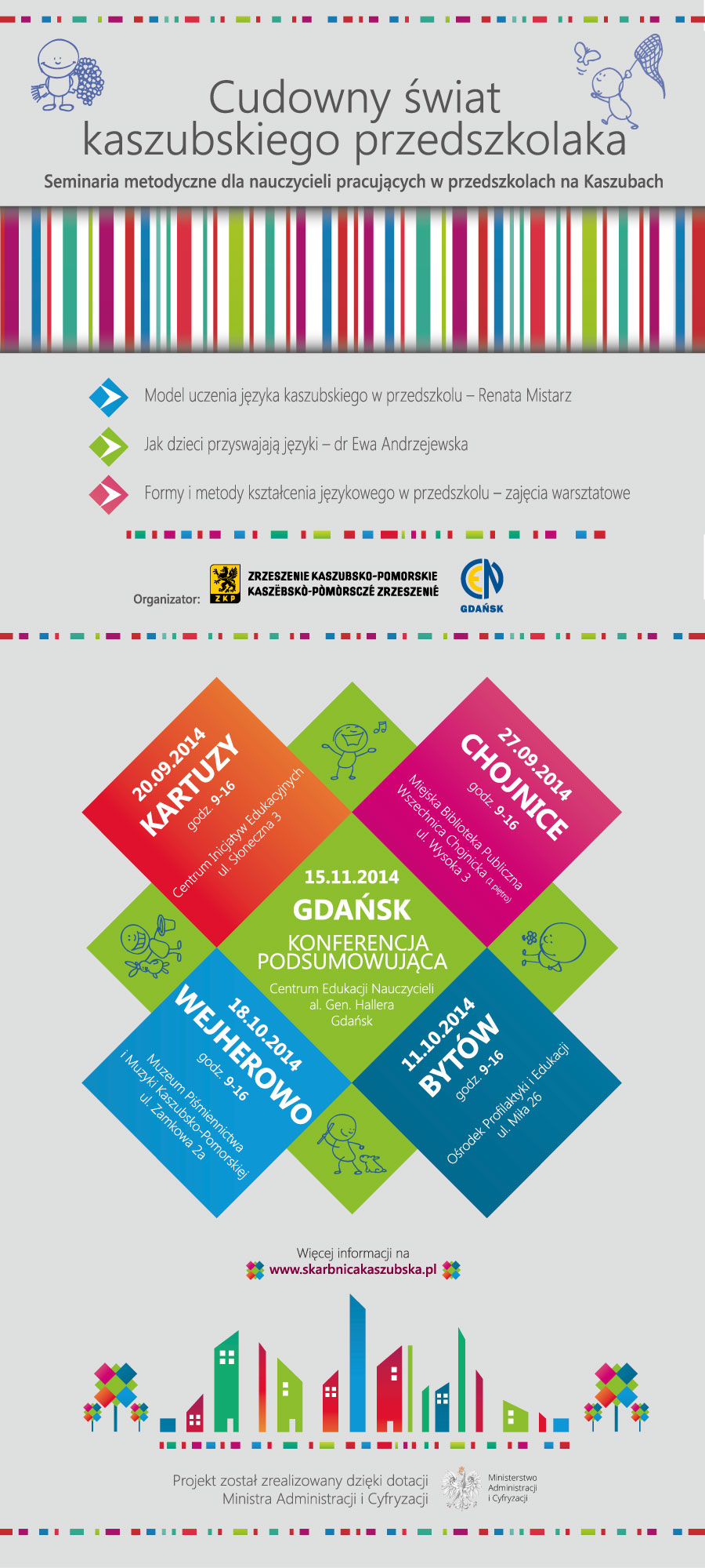 10.00-10.10 Ewa Furche (Wicedyrektor CEN) i Lucyna Radzimińska (ZKP), Otwarcie konferencji 10.10-10.40 dr Ewa Andrzejewska (UG) ,Język kaszubski w przedszkolu – wyzwania i szanse 10.40-11.10 Ewa Furche (CEN), Czas zacząć od przedszkola 11.10-11.40 Renata Mistarz (CEN), O realizacji projektu „Cudowny świat kaszubskiego przedszkolaka” w roku 2014 i jego perspektywicznych uwarunkowaniach 11.40-12.10 Przerwa kawowa 12.10-12.50 dr Tomasz Wicherkiewicz (UAM), Doświadczenia dwujęzycznych przedszkoli w Europie 12.50-13.20 Małgorzata Koczyk (CWR), Po co kaszubski w przedszkolu? O kaszubskim modelu edukacji, terapii i rehabilitacji 13.20-13.35 Joanna Zorn-Szumiło (Gimnazjum Nr 25 w Gdańsku) i Halina Malijewska (ZKP), Prezentacja dostępnych zasobów elektronicznych i środków dydaktycznych 13.35-14.00 Lucyna Radzimińska (ZKP) i Renata Mistarz (CEN), Dyskusja