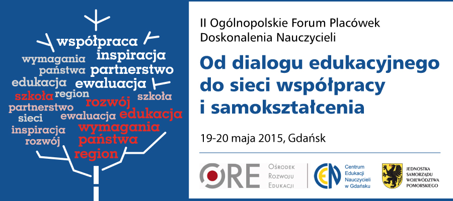 19 i 20 maja 2015 r. w Gdańsku odbyło się II Ogólnopolskie Forum Placówek Doskonalenia Nauczycieli Od dialogu edukacyjnego do sieci współpracy i samokształcenia. Adresatami wydarzenia byli dyrektorzy i przedstawiciele publicznych placówek doskonalenia nauczycieli oraz dyrektorzy i przedstawiciele departamentów ds. edukacji urzędów marszałkowskich w Polsce. Forum było czasem refleksji i dzielenia się doświadczeniem w zakresie prowadzenia dialogu edukacyjnego w regionie oraz wykorzystywania nowych form doskonalenia nauczycieli na rzecz podnoszenia jakości edukacji.
