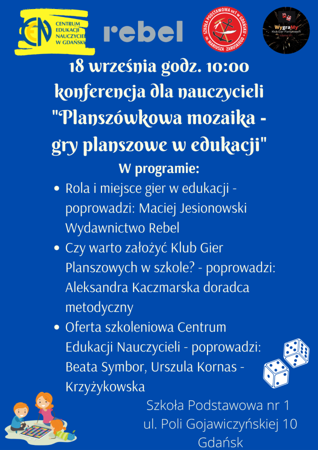 Zapraszamy nauczycieli szkół podstawowych, ponadpodstawowych oraz przedszkoli na konferencję pt. „Planszówkowa mozaika. Gry planszowe w edukacji”, której celem jest zaprezentowanie potencjału gier planszowych i zachęcenie do ich wykorzystywania w szkole.