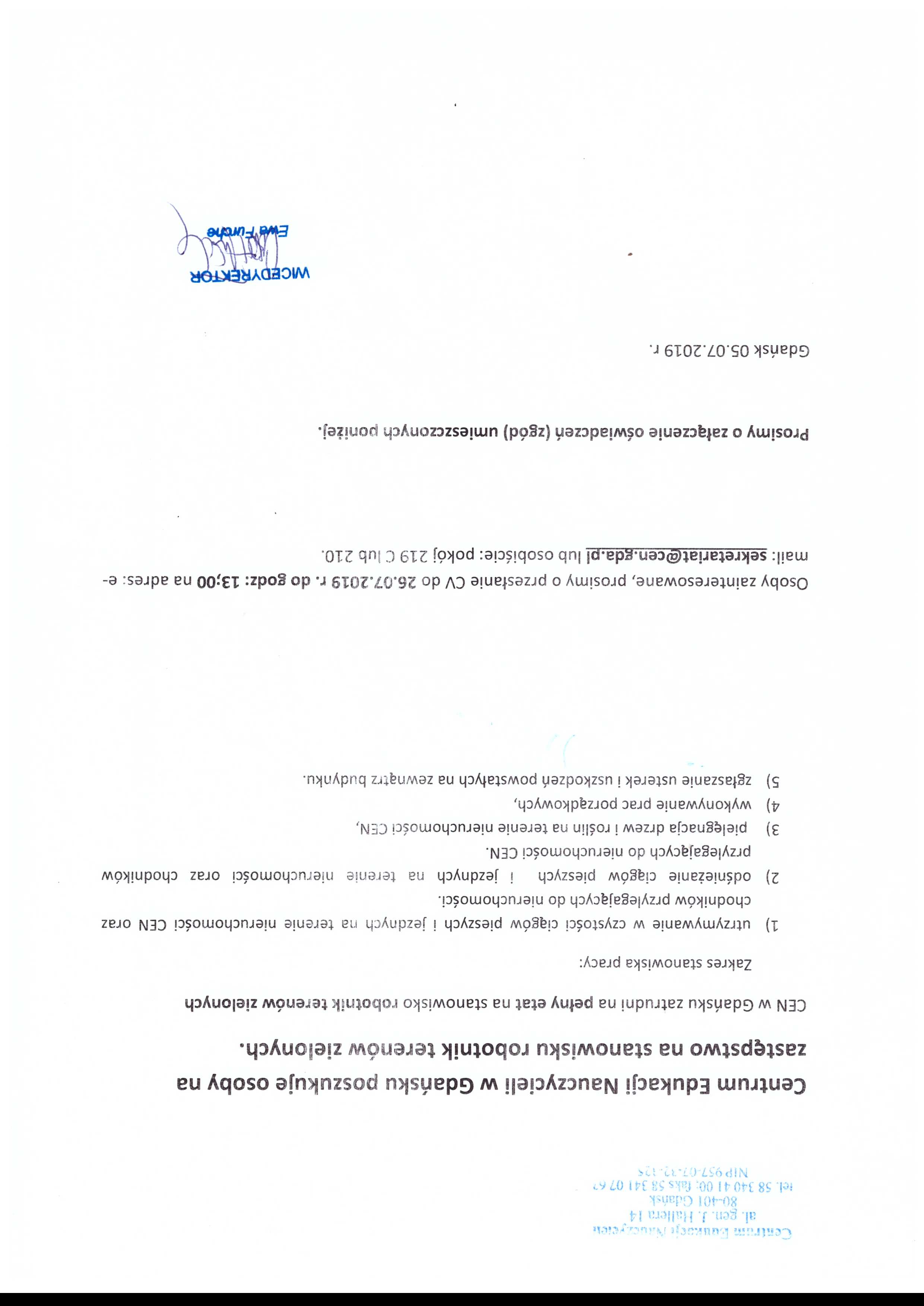 Centrum Edukacji Nauczycieli w Gdańsku poszukuje osoby na zastępstwo na pełen etat, na stanowisku robotnik terenów zielonych. Osoby zainteresowane, prosimy o przesłanie CV do 26.07.2019r. do godz: 13:00, na adres e-mail: sekretariat@cen.gda.pl lub osobiście: pokój 219 C lub 210. Zakres stanowiska pracy: 1) utrzymywanie w czystości ciągów pieszych i jezdnych na terenie nieruchomości CEN oraz chodników przylegających do nieruchomości, 2) odśnieżanie ciągów pieszych i jezdnych na terenie nieruchomości oraz chodników przylegających do nieruchomości CEN, 3) pielęgnacja drzew i roślin na terenie nieruchomości CEN, 4) wykonywanie prac porządkowych, 5) zgłaszanie usterek i uszkodzeń powstałych na zewnątrz budynku. Prosimy o załączenie oświadczeń umieszczonych poniżej. szczegóły: ZOBACZ oświadczenie1: OTWÓRZ oświadczenie2: OTWÓRZ