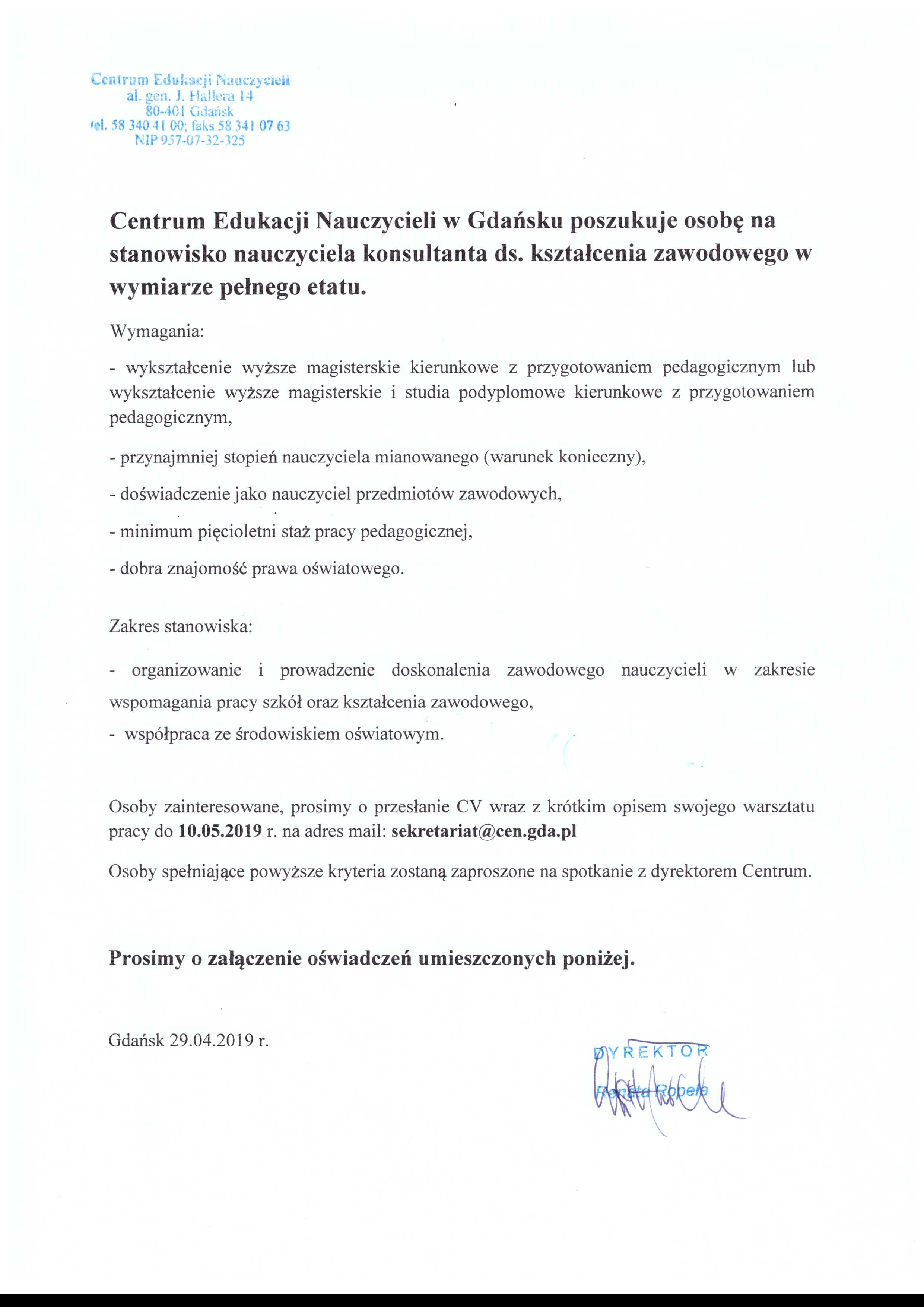 Centrum Edukacji Nauczycieli w Gdańsku poszukuje osoby na stanowisko nauczyciela konsultanta ds. kształcenia zawodowego w wymiarze pełnego etatu. Termin zgłoszeń mija 10 maja 2019 roku. Zgłoszenia na adres e-mail: sekretariat@cen.gda.pl szczegóły: ZOBACZ oświadczenie RODO: OTWÓRZ zgoda kandydata: OTWÓRZ