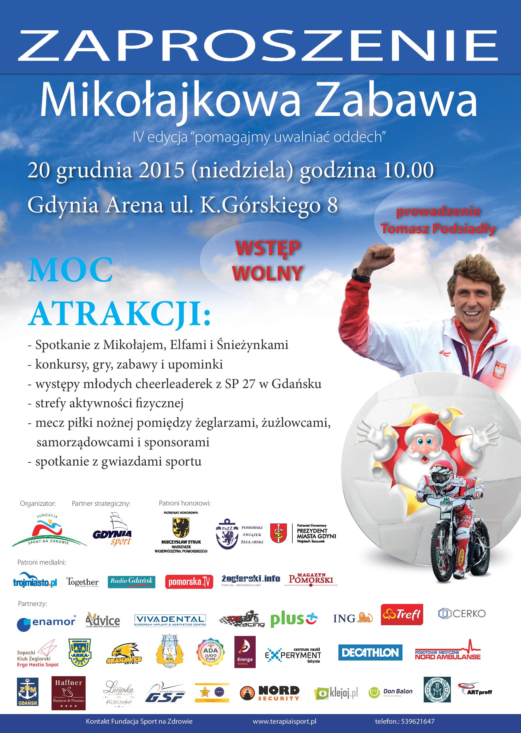 Fundacja Sport na Zdrowie zaprasza 20 grudnia br. (niedziela) o godzinie 10.00, do Gdyni Areny na spotkanie z Mikołajem pt. Pomagajmy uwalniać oddech. Dzieci będą miały okazję uczestniczyć w strefach wspólnych gier, konkursów i zabaw oraz porozmawiać z Mikołajem i Elfami. Organizatorami przestrzeni aktywności dla najmłodszych będą m.in.: Program Edukacji Morskiej, Pomorski Okręgowy Związek Żeglarski, Arka Gdynia, Seahawks Gdynia – Futbol Amerykański, UKS Ada Judo, Don Balon, Gdańska Szkoła Floretu, Gdyńskie Centrum Sportu, Centrum Nauki EXPERYMENT, Młode cheerleaderki ze Szkoły Podstawowej nr 27 w Gdańsku. Wolontariusze z Akademii Marynarki Wojennej będą przygotowywać z dziećmi ozdoby świąteczne oraz pisać listy do Świętego Mikołaja. Miłośny sportu będą mogli obejrzeć turniej piłki nożnej.
