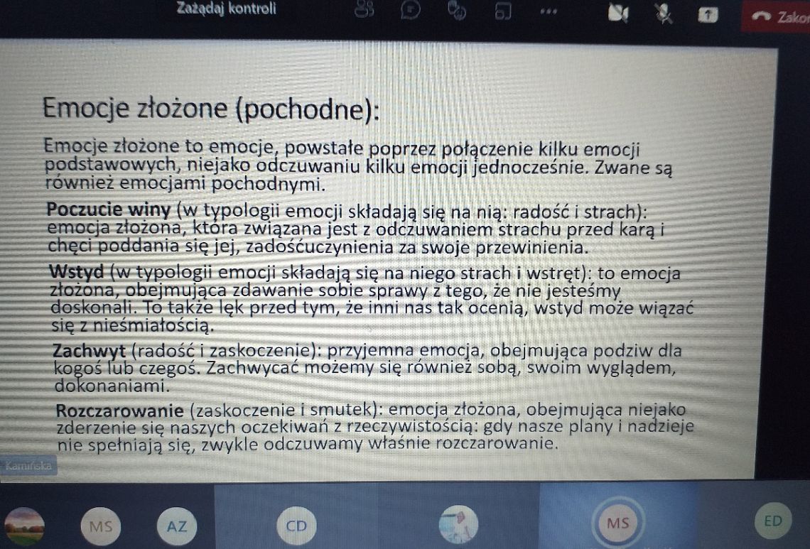Kolejna prezentacja przygotowana przez panią Monikę przedstawiała tak zwane emocje złożone: POCZUCIE WINY, WSTYD, ZACHWYT,