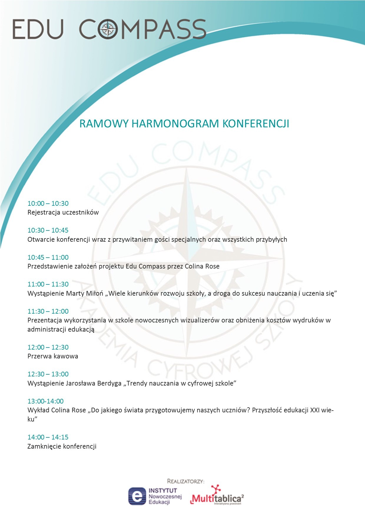 http://www.ine.com.pl/edu-compass/ PROGRAM w załączeniu INFORMACJE O PRELEGENTACH Colin Rose - Brytyjski psycholog, jeden z najbardziej uznanych światowych autorytetów w dziedzinie nowoczesnych metod efektywnego uczenia się. Doradca rządu brytyjskiego, Członek Royal Society of Arts, współtwórca brytyjskiej „Kampanii na Rzecz Uczenia się” („Campaign for Learning”) – towarzystwa naukowego pod patronatem rządu. Twórca „Metody Colina Rose” – autorskiej metody superszybkiej nauki języków obcych, dostępnej już także w Polsce i wykorzystywanej m.in.. przez Policję, Biuro Ochrony Rządu i szybko rosnące grono celebrytów.