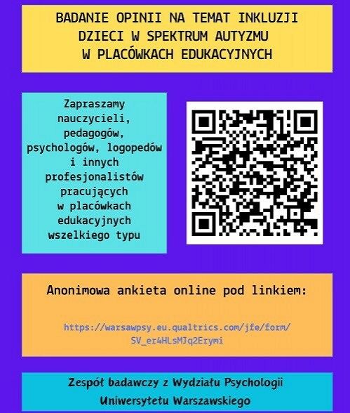 w imieniu zespołu badawczego pod kierownictwem prof. dr hab. Ewy Pisuli z Wydziału Psychologii Uniwersytetu Warszawskiego zapraszam do udziału w badaniu dotyczącym edukacji włączającej dzieci w spektrum autyzmu.