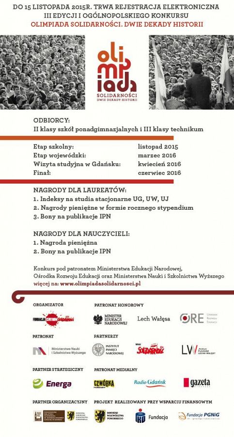 Fundacja Centrum Solidarności zaprasza uczniów II klas szkół ponadgimnazjalnych i III klas technikum do wzięcia udziału w III edycji ogólnopolskiego konkursu Olimpiada Solidarności. Dwie dekady historii. Celem konkursu jest upowszechnienie wśród młodzieży ponadgimnazjalnej wiedzy na temat historii najnowszej Polski, przybliżenie polskiego dziedzictwa historycznego i polskiego dorobku kulturowego.