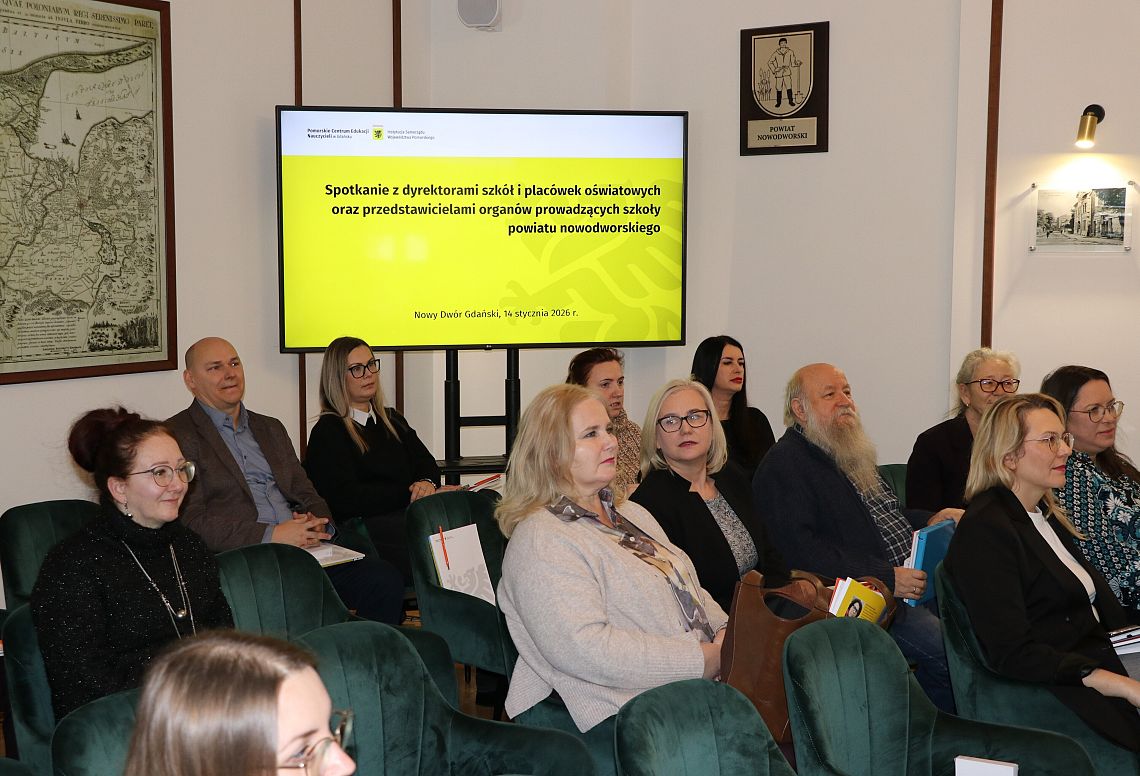Dużo energii, ważne tematy i konstruktywna rozmowa! Tak wyglądało pierwsze spotkanie dyrektorów szkół i placówek oświatowych oraz przedstawicieli organów prowadzących powiatu nowodworskiego. Odbyło się ono 14 stycznia 2026 r. w budynku Starostwa Powiatowego w Nowym Dworze Gdańskim. Wspólnie z dyrektorami szkół w spotkaniu udział wzięli: