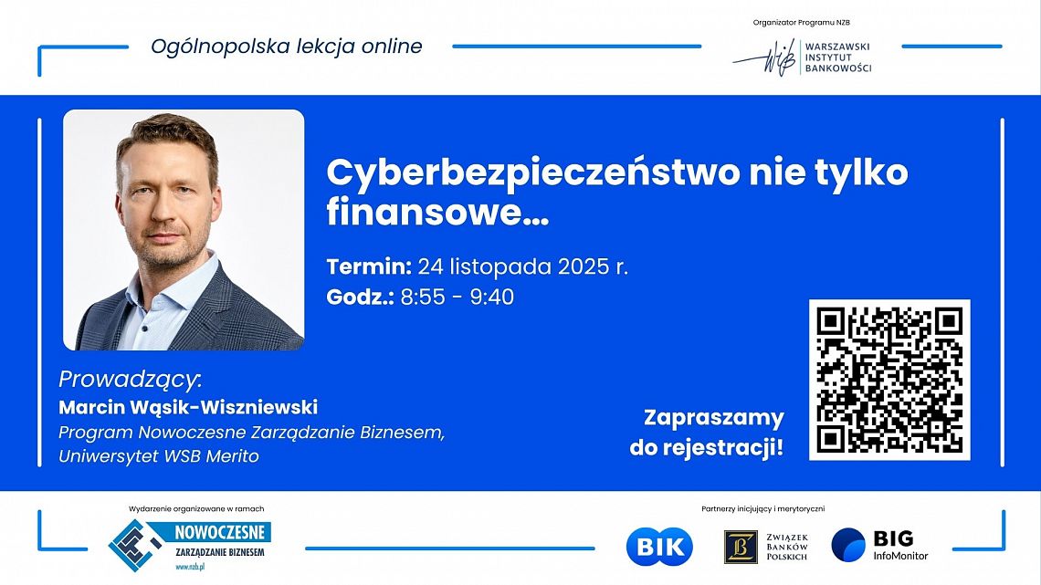 Fundacja Warszawski Instytut Bankowości oraz Biuro Informacji Kredytowej serdecznie zapraszają nauczycieli oraz uczniów starszych klas szkół podstawowych i szkół ponadpodstawowych do udziału w cyklu ogólnopolskich lekcji online pt. „Cyberbezpieczeństwo i wiarygodność nie tylko finansowa”, prowadzonych przez wykładowców Programu Nowoczesne Zarządzanie Biznesem.