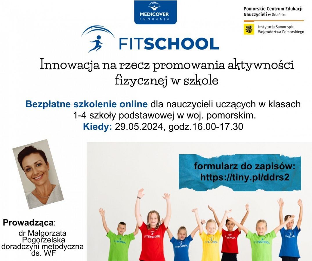 Czy słyszeliście już o FitSchool - narzędziu wspomagającym pracę nauczycieli na rzecz promowania aktywności fizycznej wśród najmłodszych? Jeśli nie, to zapraszam nauczycieli i nauczycielki klas 1-4 szkoły podstawowej, z woj. pomorskiego na bezpłatne szkolenie online. Podczas spotkania zaprezentuję platformę FitSchool i korzyści zdrowotne, jakie może przynieść uczniom praca z wirtualnym trenerem. Porozmawiamy o genezie i głównych założeniach programu, dowiemy się, jak aktywować indywidualne konta użytkownika, poznamy rolę nauczyciela podczas treningów 3- i 30-minutowych oraz przećwiczymy poruszanie się po platformie.